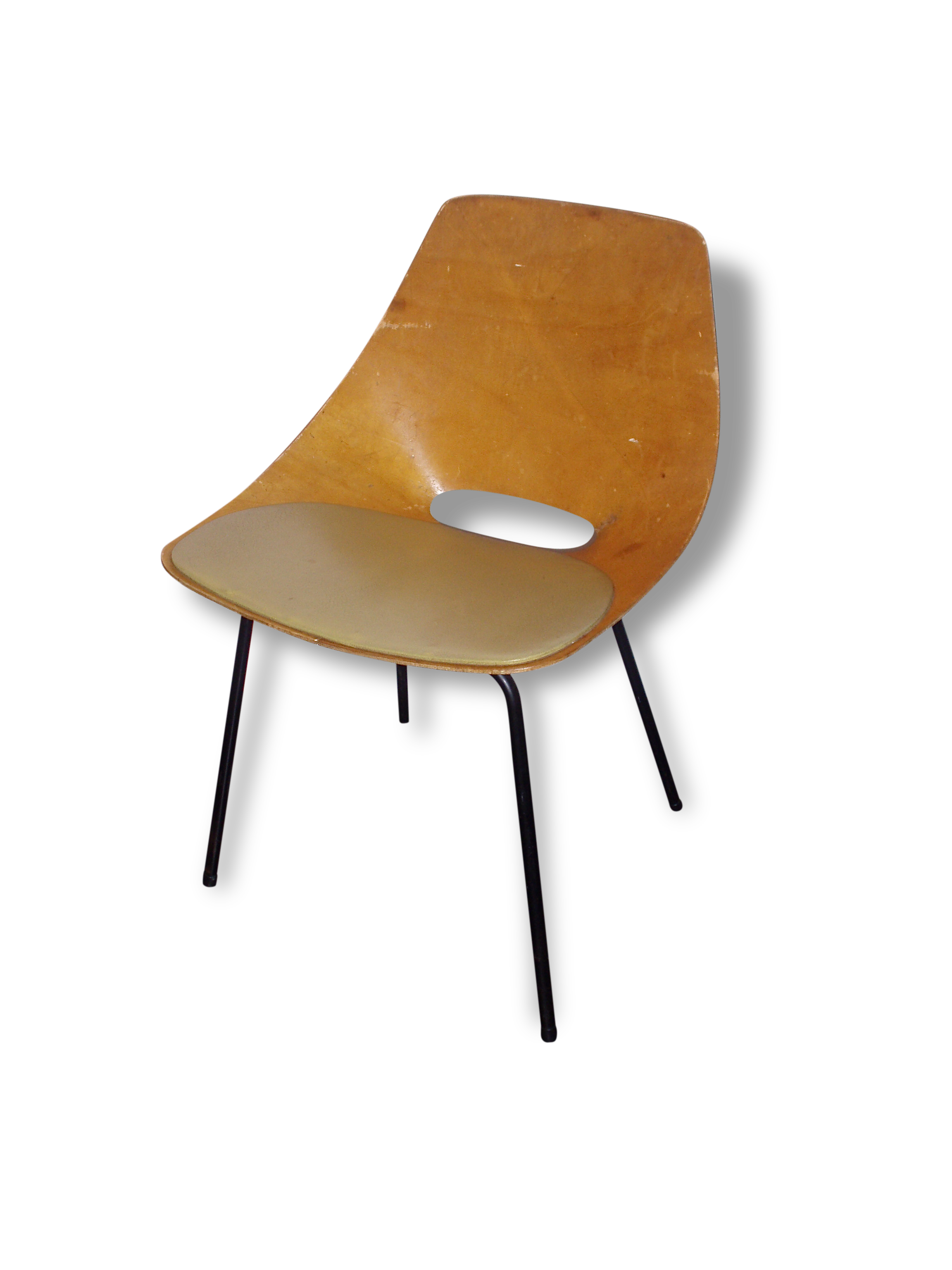 Chaise Guariche / Il s'agissait de la toute première assise.. Découvrez aussi la chaise tonneau gris clair amsterdam. Composée d'un piètement métallique tubulaire et d'une assise en contreplaqué plié. Salon napoli de pierre guariche, 1968. Bon état, quelques traces d'usure. Pierre guariche iron feet and walnut seat chair with attached magazine rack.